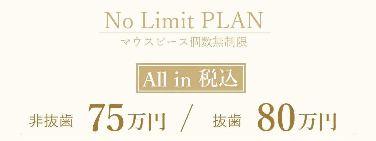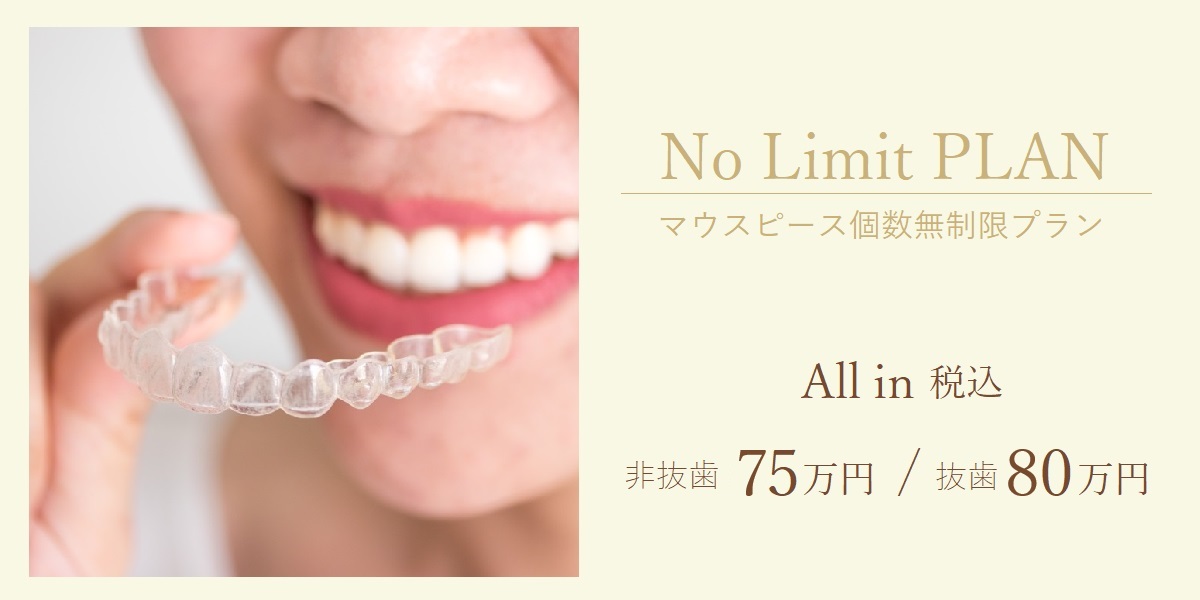 【No Limitプラン】はインビザラインのマウスピース個数無制限のプランです。抜歯矯正・Eライン横顔矯正などほぼ全ての矯正治療に対応できます。詳しくは【無料カウンセリング】